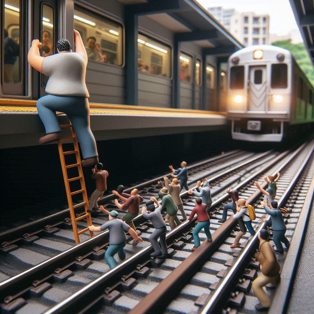 For a more stylized case, consider a status-quo reversal of Trolley Footbridge: a very large man is already on the tracks, and—as the trolley approaches—asks you to lower a ladder from your overhead footbridge so that he can escape. If you help him, the unimpeded trolley will go on to instead kill five others further down the track. Should you help the one to escape, and thereby condemn five to death?