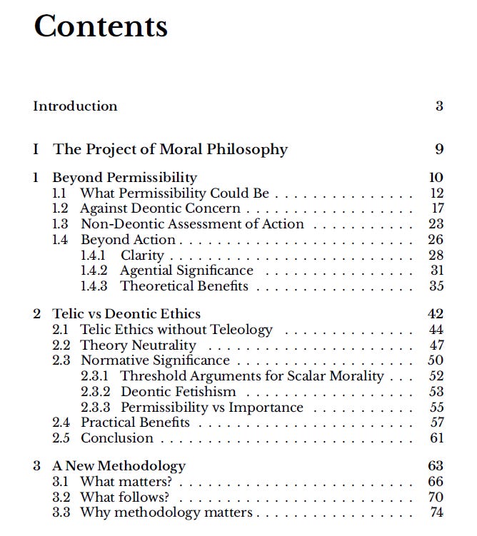 I’m super-excited about the project (and its potential to reshape how we think about ethical theory), and am finding it a blast to write so far. One useful bit of advice I received about writing an academic monograph is to get feedback early and often. So I’m sharing my current outline here, in the hopes that some colleagues reading this may be interested enough to (i) want me to come give a talk to their department,2 and/or (ii) offer feedback on an early draft at some point.3