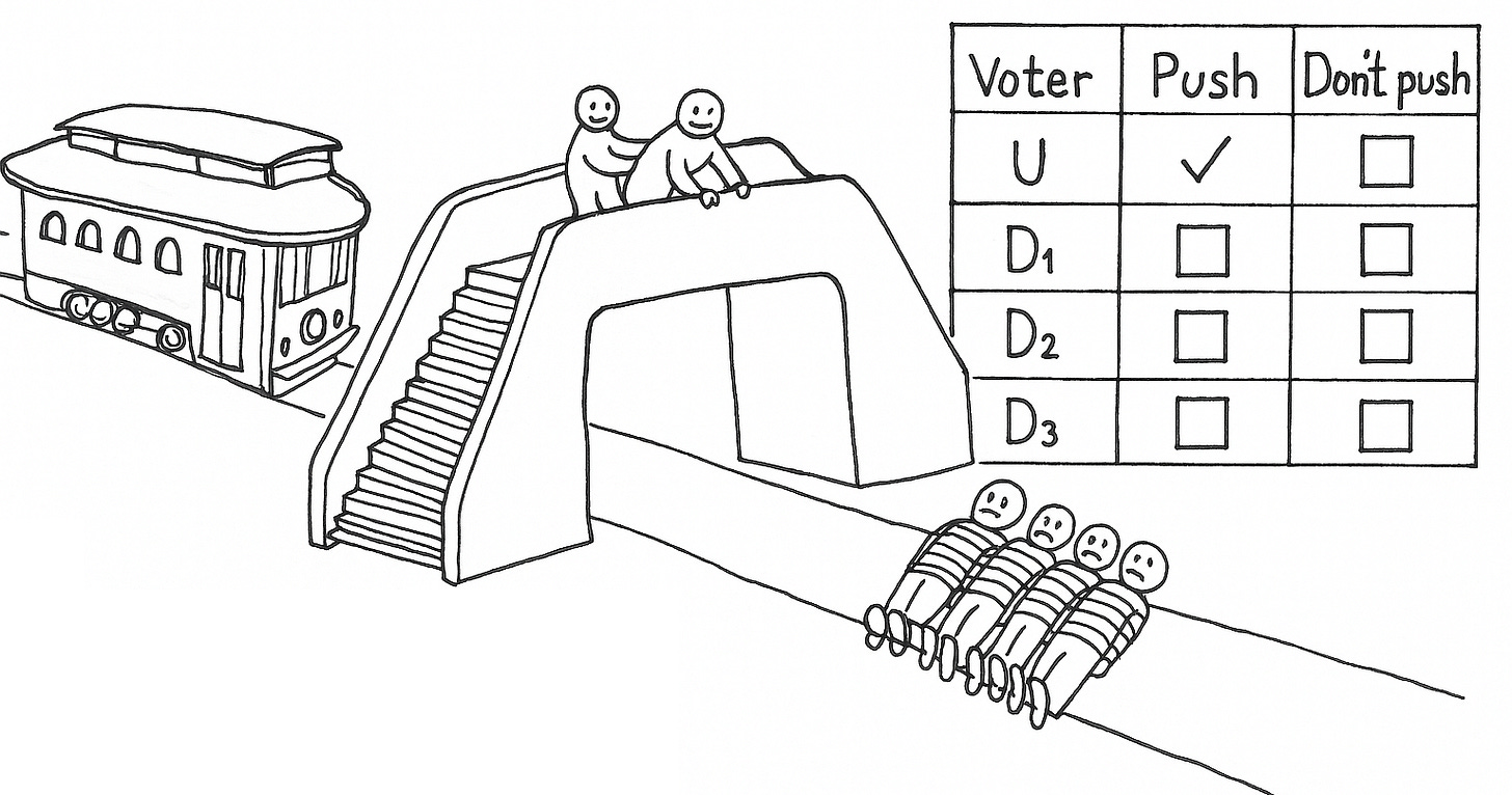 Abstain, presumably. Voting to push might make them complicit, and they care about their clean hands more than anything else in the world. But they have no reason to vote against the robot pushing. They want the robot to push! (That’s what makes them quiet rather than robust deontologists.) So they should abstain, and let the utilitarian’s vote carry the day and “wrongly”—but heroically—save the five for them.