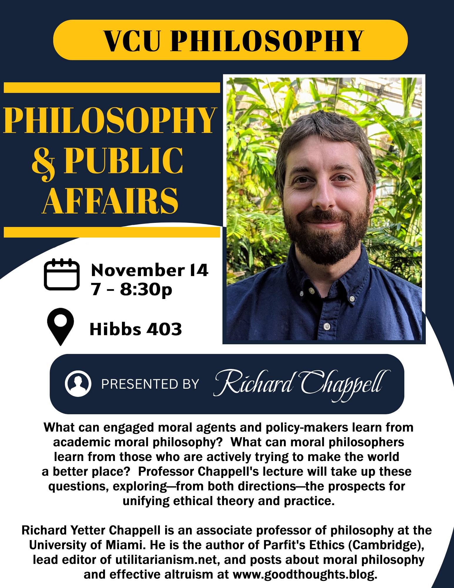 I’m looking forward to giving VCU’s 2024 Philosophy & Public Affairs lecture this Thursday, on the topic of Bridging Theory & Practice. It’s a public lecture, so feel free to come along if you’re in the area — see the poster below for details. (I also have some free time in Richmond on Friday morning, so if any readers in the area would like to meet over coffee, feel free to shoot me an email.)