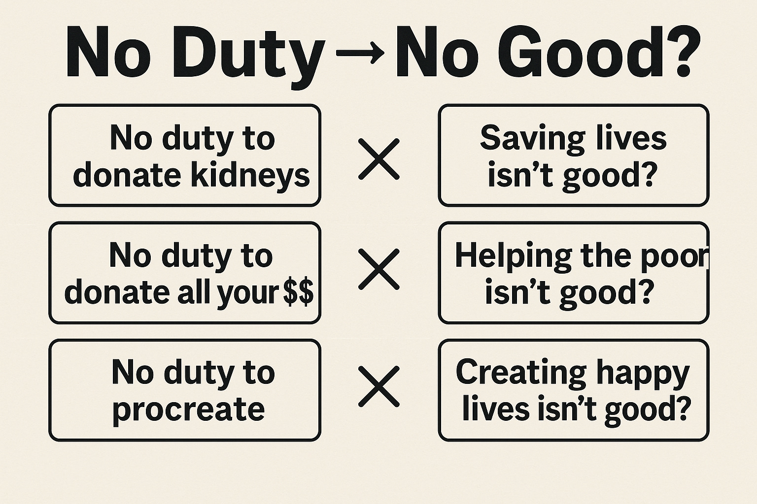 I’m especially shocked by how many fall for (what we might call) the “No Duty → No Good” fallacy. As far as I can tell, the error is limited to reproductive ethics: I’ve never heard people reason so badly about other topics. But whatever the explanation, it’s incredibly common for (even otherwise intelligent) people to affirm the following bad argument: “It can’t be good to create happy lives, because that would generate implausible procreative duties: we would all be obligated to have as many kids as possible.”1 Since there’s no such duty, they reason, there can’t be anything good about the act in question.