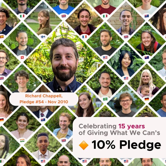Giving What We Can is celebrating 15 years of operation. I took their🔸10% Pledge as a grad student back in 2010,1 and haven’t regretted it for a moment. My resulting donations (fast approaching $100k in total) could be conservatively estimated2 to have saved ~20 lives (or 1000 QALYs), which is a nice thought!